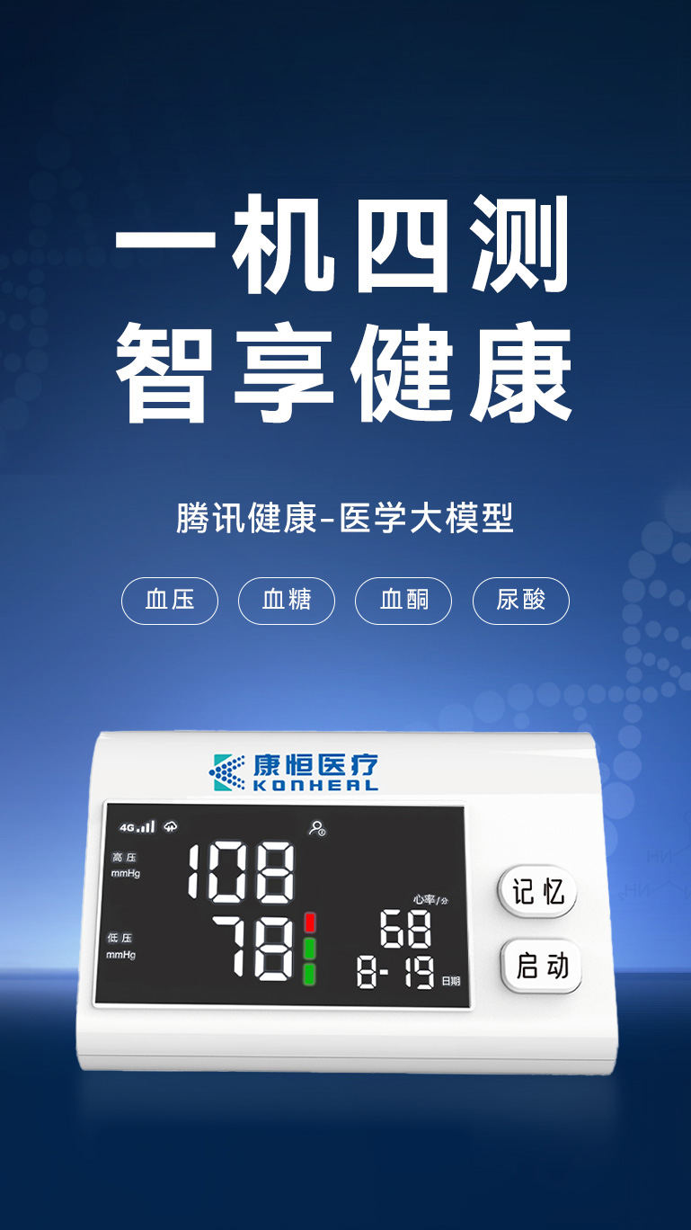 只需一台4G多参数检测仪,轻松测血压、血糖、尿酸等多项指标。数据自动上传云端,AI算法深度分析,生成专属健康趋势报告,潜在风险一目了然。